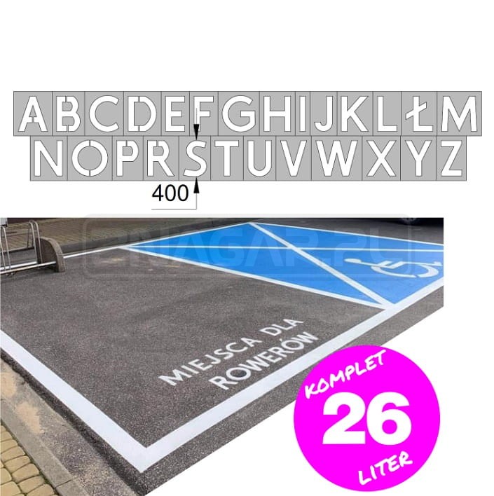 Płaskie, malarskie szablony drogowe do oznakowania poziomego wykonane z blachy czarnej gr. 0,8-1 mm. Produkt wielokrotnego użycia na dowolnej powierzchni. Łącznie 26 liter.