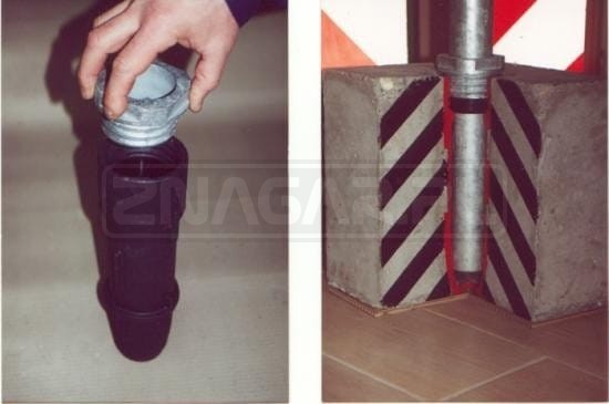 - po związaniu zaprawy, można użytkować tuleję zgodnie z rysunkiem. Przed zainstalowaniem słupka, trzeba założyć nakrętkę i wkładkę zaciskową. Po włożeniu słupka w tuleję, należy dokręcić nakrętkę.