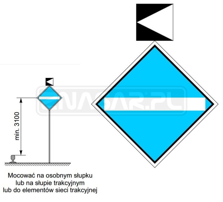 Wskaźnik We2c oznacza, że należy opuścić pantografy przy jeździe na tor odgałęziający się w lewo od toru, przy którym ustawiony jest wskaźnik.