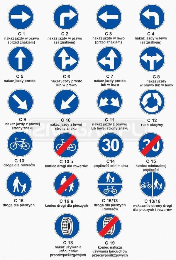 – wymaganą metodę jazdy na skrzyżowaniu lub innym miejscu, gdzie istnieje możliwość zmiany kierunku ruchu (znaki od C-1 do C-12),